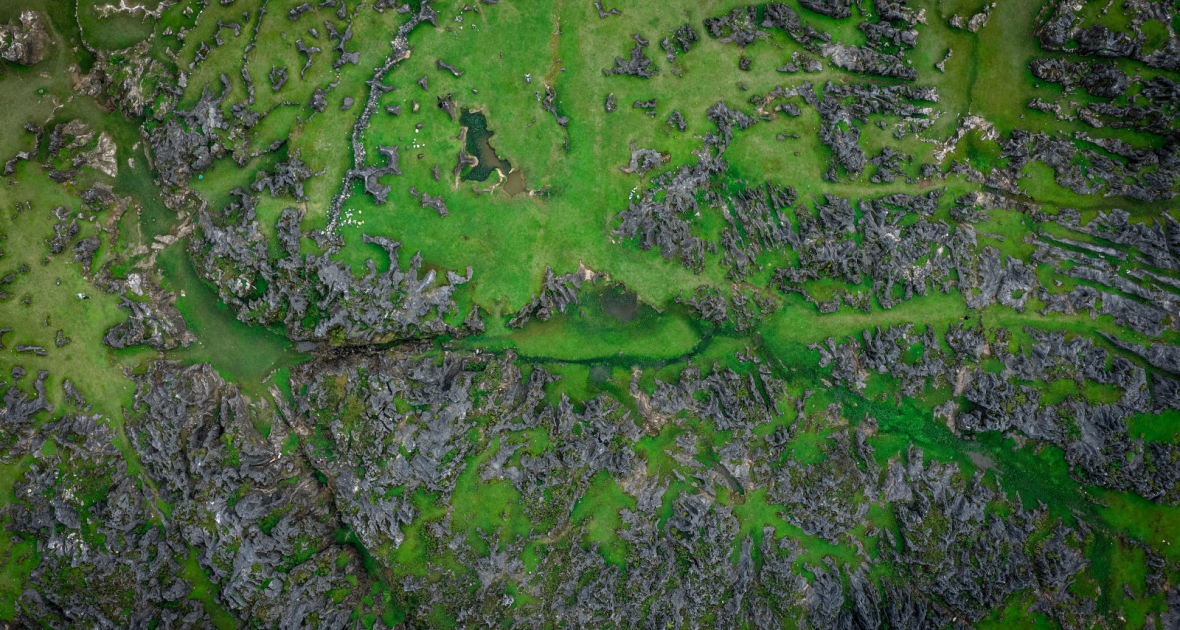 เริ่มต้นด้วยการเดินป่าจาก "มหาสมุทรหิน" ที่กว้างขวาง ซึ่งเป็นทัศนียภาพแบบคาร์สท์ที่เกิดจากการเคลื่อนตัวของพื้นโลกมาหลายล้านปี หินสีเทาและหินยักษ์ที่เกิดขึ้นเรียงรายกัน สร้างเป็น "ป่าหินขนาดเล็ก" ที่คล้ายเขาวงกตตามธรรมชาติ ให้ผู้นำนำทางค้นหาหินแปลกตา ทำความเข้าใจสาเหตุของลักษณะภูมิประเทศ เช่น "ร่องน้ำ" และ "กลุ่มยอดเขา" เพื่อเริ่มต้นความรู้เกี่ยวกับตำนานทางธรณีวิทยาของ "จังหวัดสวนภูเขา" กุ้ยโจว